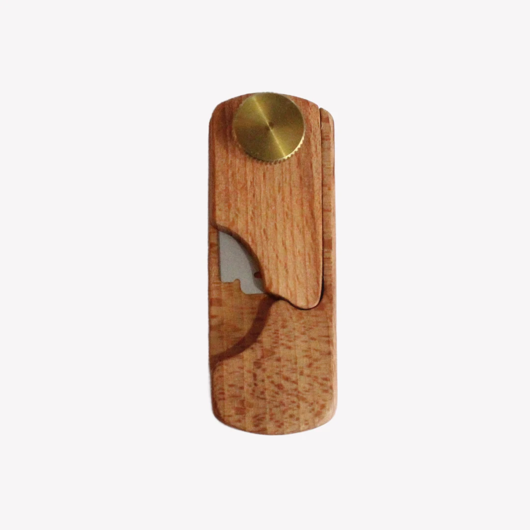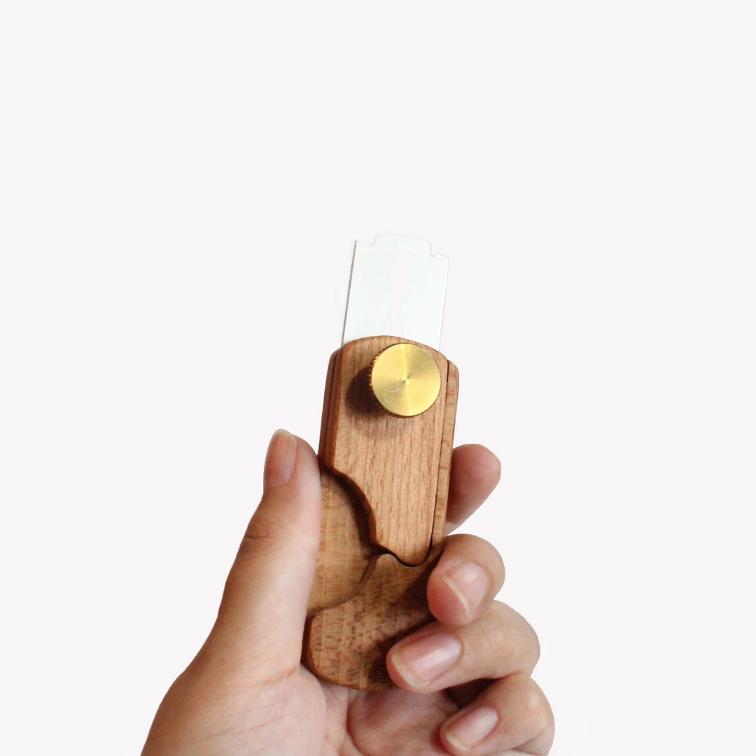 En handgjord snittkniv i trä med justerbart blad som gör det enkelt att anpassa vinkeln för exakta snitt i bröddeg. Perfekt för att skapa fina mönster och en luftigare deg. Vid köp ingår fem blad.
